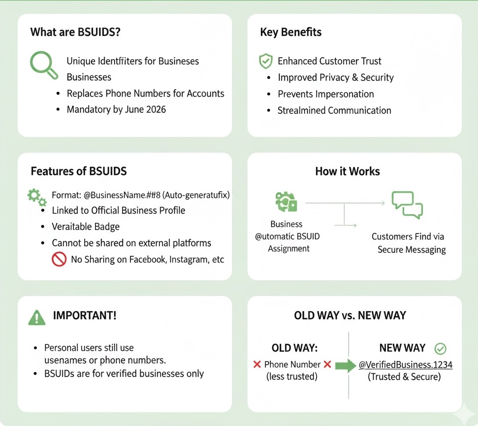Business-Scoped User ID is a unique identifier for a user that is specific to their interaction with a particular business. BSUIDs will replace phone numbers as the primary way businesses identify users.