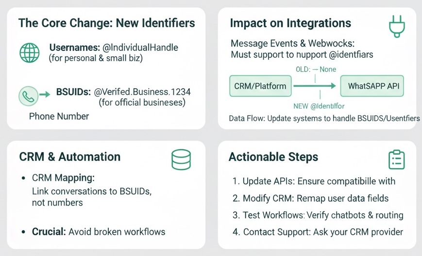 Most WhatsApp integrations currently assume phone numbers as the core identifier for users. With usernames and BSUIDs, integrations will need to support alternative identifiers in message events and webhooks.