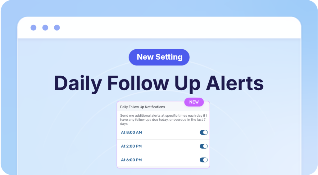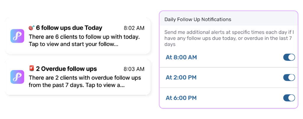 Get daily summaries on your phone at your preferred times, showing how many follow-ups are due today and which ones are overdue from the past week.