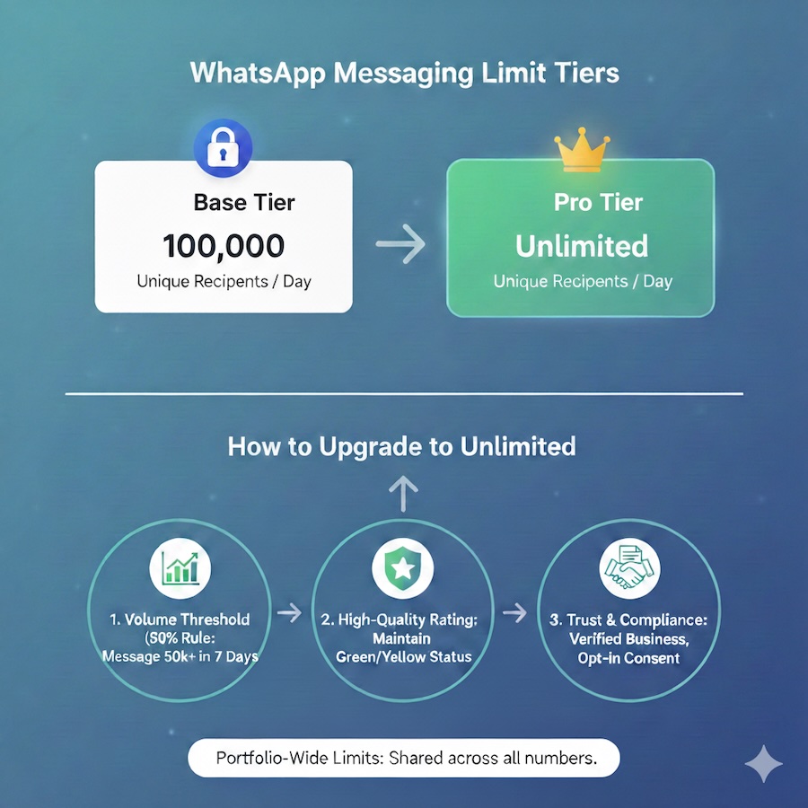 As of the latest update, you can send your campaign to up to 100,000 unique users in a 24-hour window once you verify your business and maintain a healthy messaging quality. You can eventually level up to unlimited recipients as you maintain high-quality messaging and compliance.