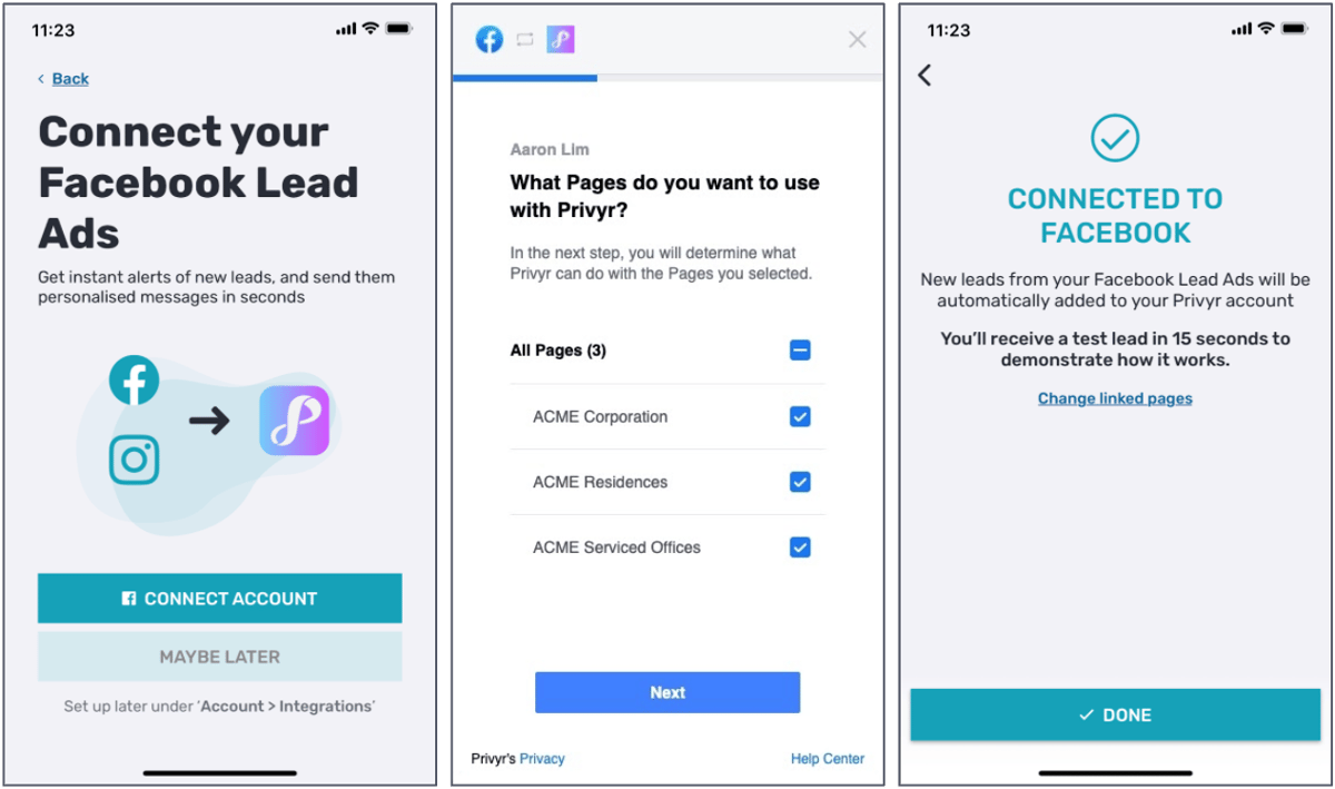Quickly connect to Facebook directly from the Privyr app. Simply log in, select the Facebook Pages you wish to receive leads from, and click done - that's it!