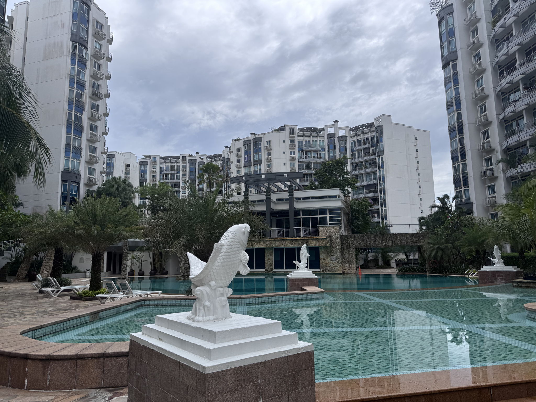 Step inside to find exquisite features that elevate the living experience, including stylish cabinets, a spacious dining table, and a relaxing poolside view. The unit also boasts air conditioning to keep you cool in the tropical climate, security guard services for peace of mind, and covered car parking for your convenience.